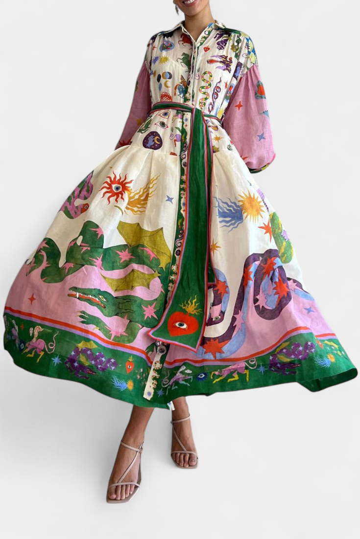Robe Midi Micaela avec Manches Lantern et Taille Cintrée