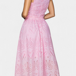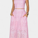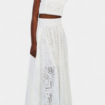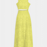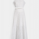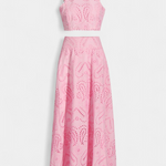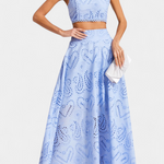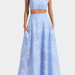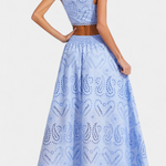 Romantique et léger, Danitza est un ensemble de deux pièces qui fusionne la fraîcheur estivale avec la délicatesse de la dentelle florale découpée. Le top court sans manches, avec col haut et finitions festonnées, apporte une touche élégante et sophistiquée. Associé à la jupe maxi taille haute et à volants amples, ce look met en valeur chaque mouvement avec grâce et féminité.
