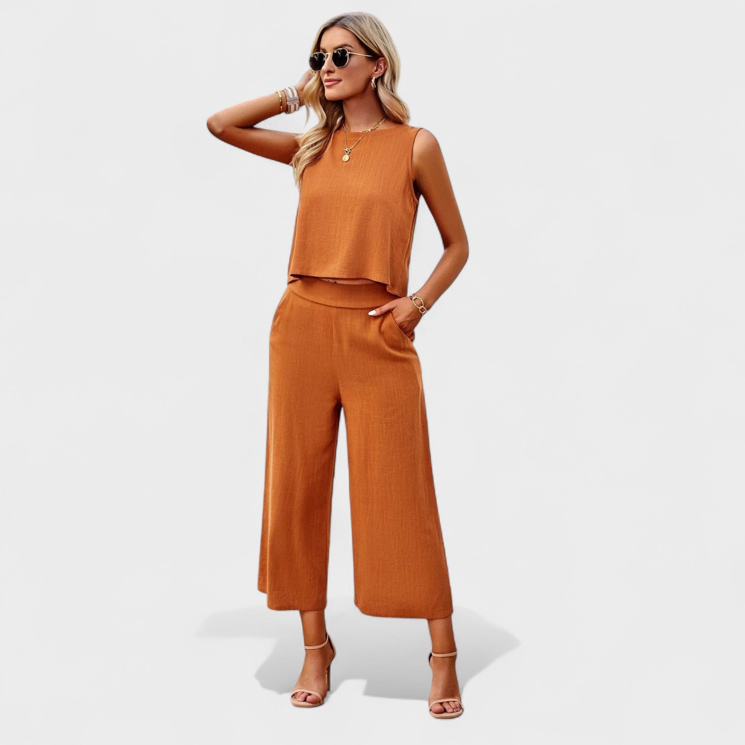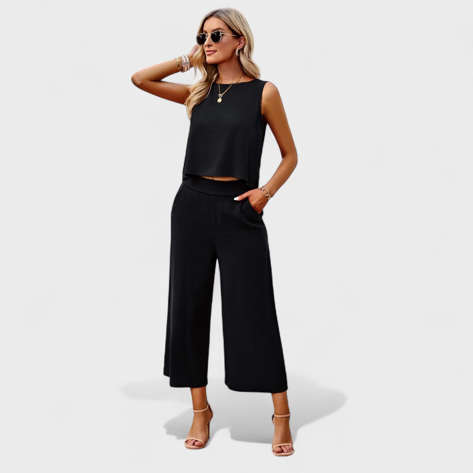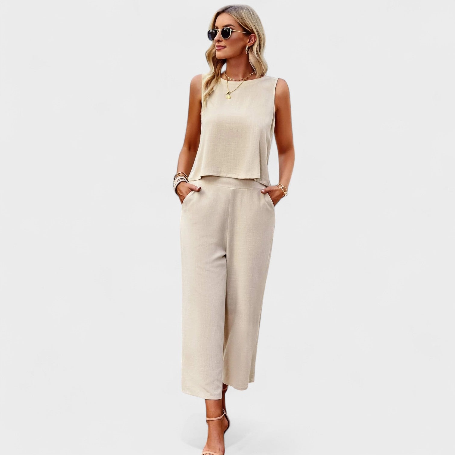 Cet ensemble en lin est le choix parfait pour ceux qui apprécient l'élégance sans effort. Avec un top sans manches à coupe droite et un pantalon droit taille haute, il offre un look moderne, frais et extrêmement confortable.