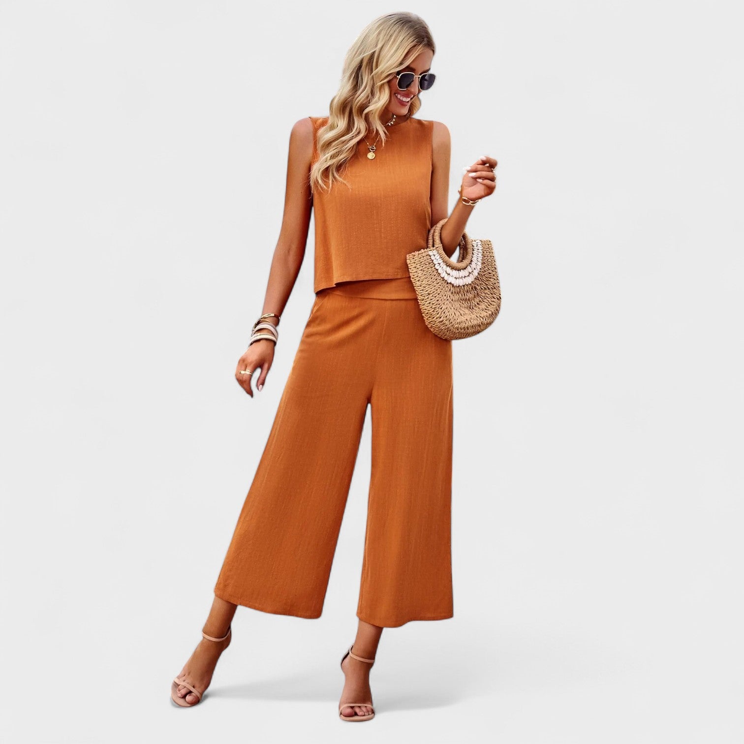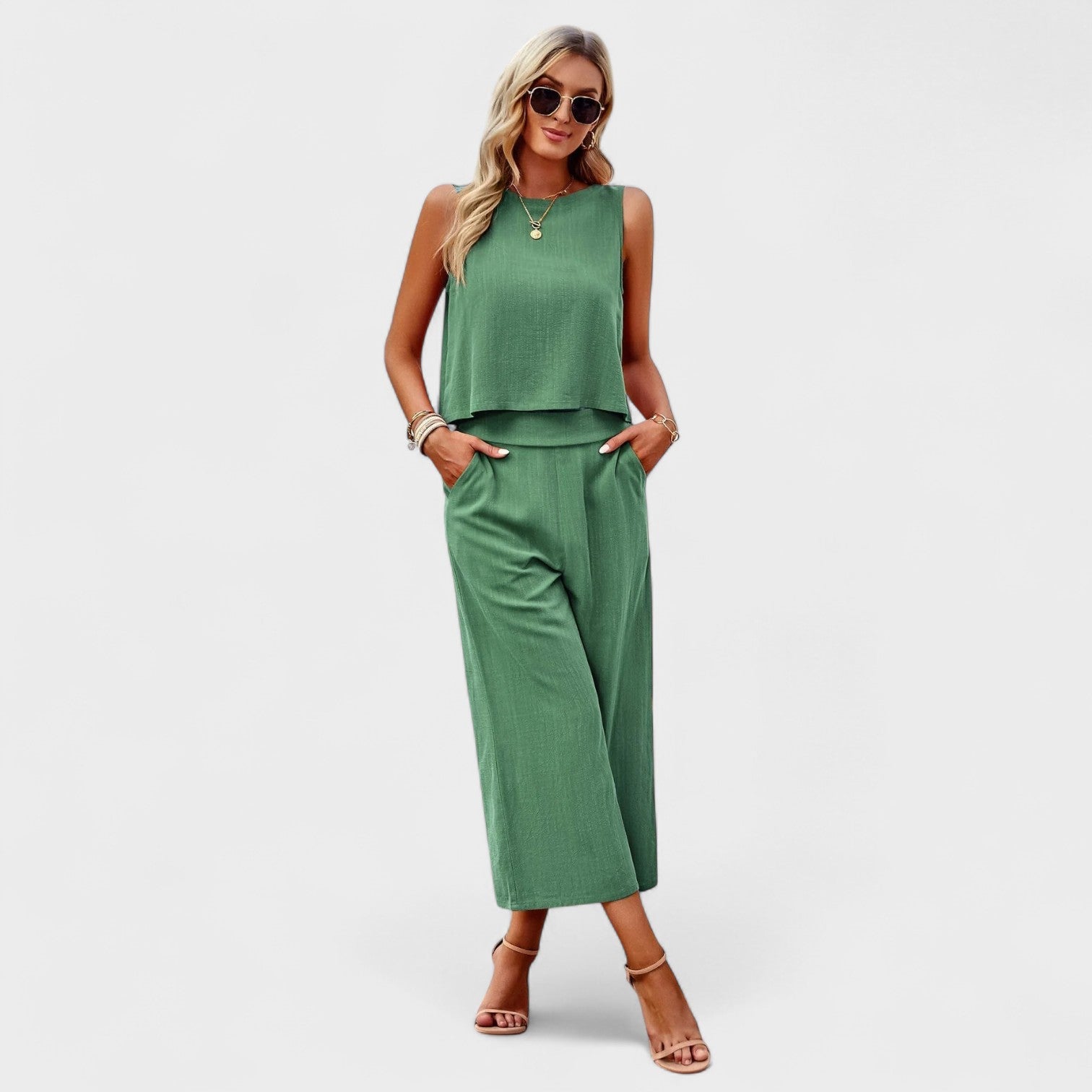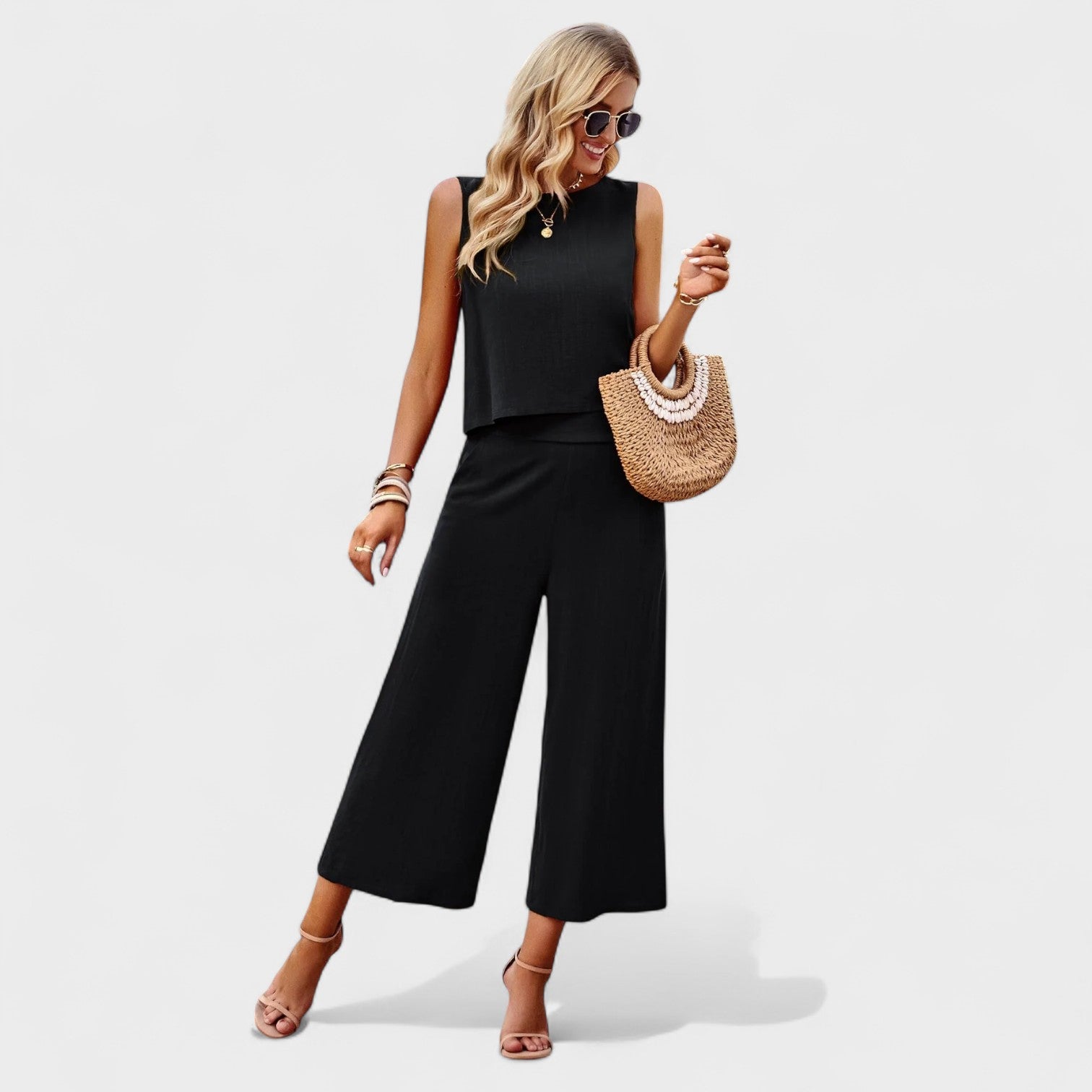 Cet ensemble en lin est le choix parfait pour ceux qui apprécient l'élégance sans effort. Avec un top sans manches à coupe droite et un pantalon droit taille haute, il offre un look moderne, frais et extrêmement confortable.