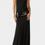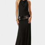 Avec un éclat subtil et une silhouette captivante, la robe Georgia est faite pour se démarquer à chaque événement élégant. Son décolleté drapé halter et son dos entièrement découvert offrent un équilibre parfait entre sophistication et sensualité, tandis que la bande de sequins apporte une touche de luxe raffiné.