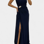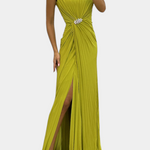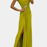Une fusion impeccable de fluidité, d'élégance et de présence scénique. Shiloh se distingue par sa confection en tissu léger, un plissé méticuleux et une fente latérale qui accompagne chaque mouvement avec grâce. Le décolleté croisé encadre délicatement la poitrine, tandis que la silhouette fluide allonge la figure avec subtilité et sophistication.