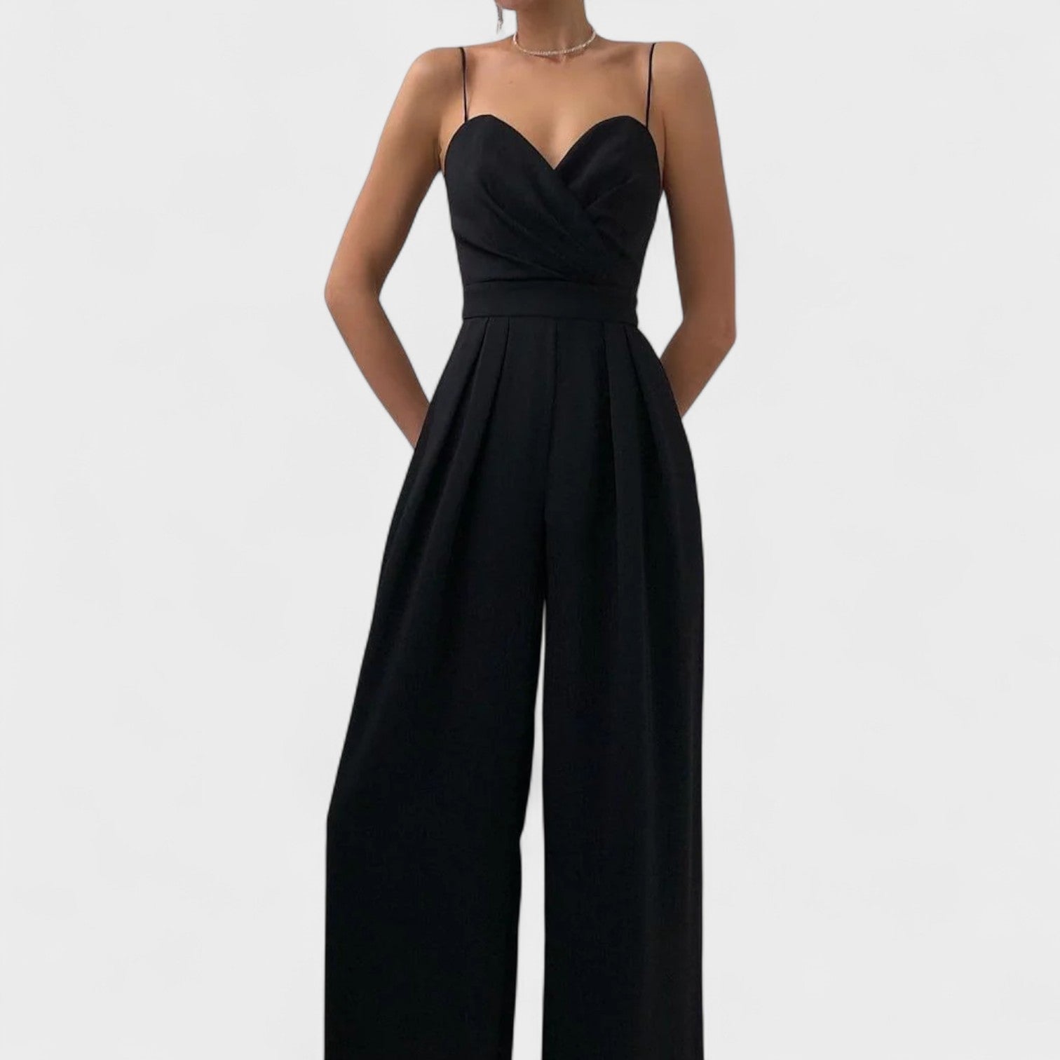 Cette combinaison longue avec des bretelles fines et un décolleté croisé est le choix idéal pour ceux qui recherchent la sophistication avec une touche moderne. Avec une taille marquée, elle met en valeur la silhouette et apporte du caractère à toute occasion - des dîners formels aux célébrations spéciales. Son design minimaliste en fait une pièce polyvalente, facile à associer avec des accessoires audacieux ou discrets, selon votre style.